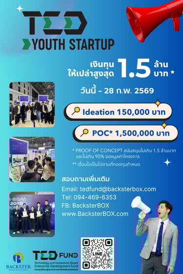 TED Youth Startup ประจำปี 2569 ทุนให้เปล่าจากกองทุนพัฒนาผู้ประกอบการเทคโนโลยีและนวัตกรรม (TED Fund) สำหรับ Startup หรือ ผู้ประกอบการ ที่มีสินค้าที่เป็นนวัตกรรมใหม่ ลอกเลียนแบบได้ยาก